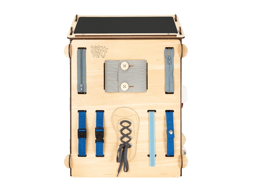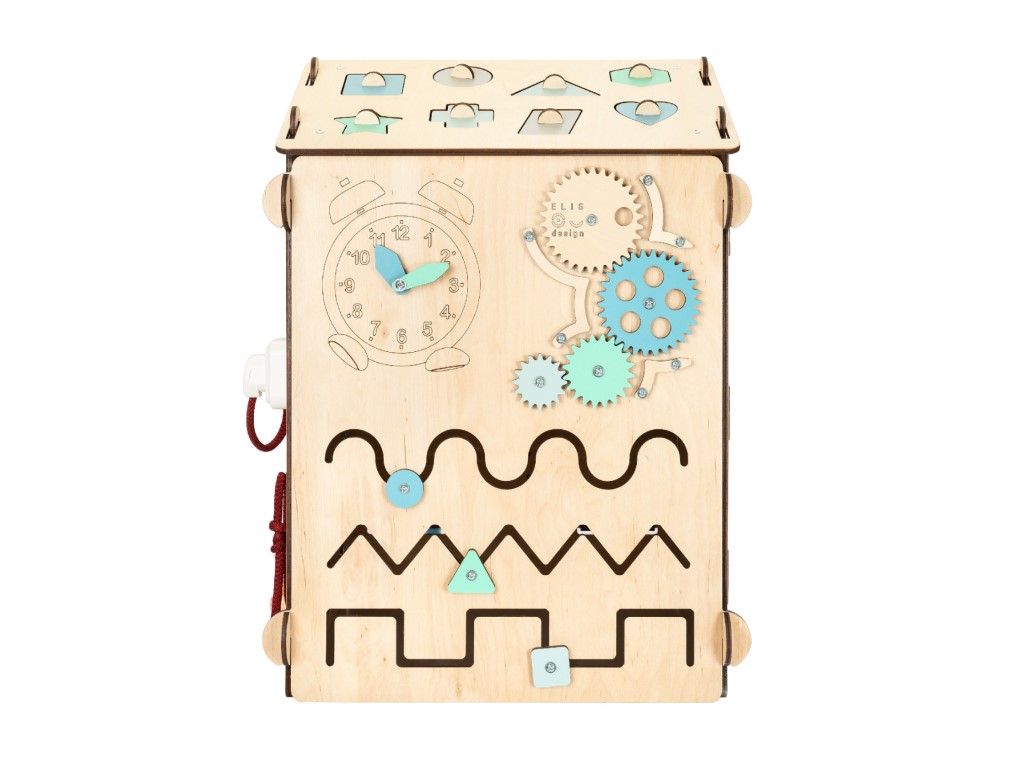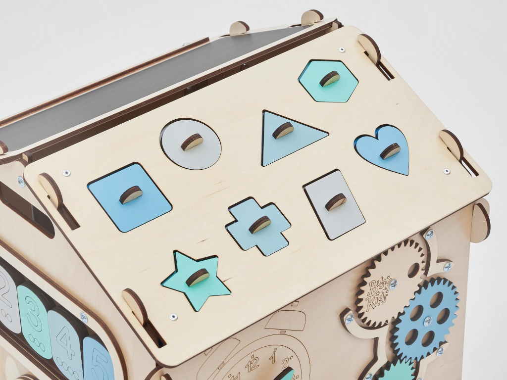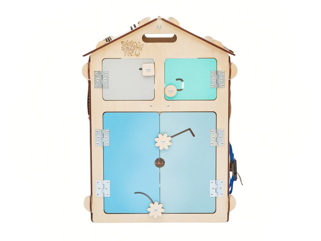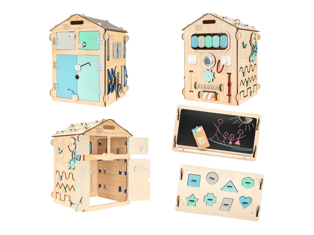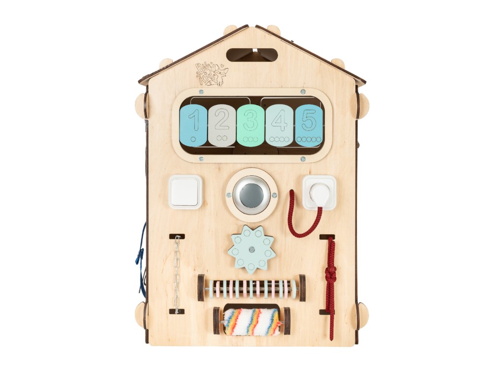 Domeček je složen ze šesti desek s prvky zaměřenými na zručnost, logiku, trpělivost a kreativitu. Dokáže dokonale vtáhnout do světa objevování a děti se stanou samy sobě nejlepšími učiteli.