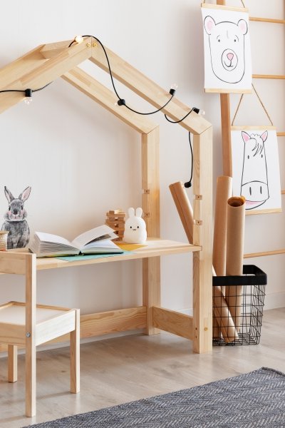 je menší policový stůl, který slouží jako příjemné místo pro malování, hraní i učení vašeho dítěte. Skvěle se hodí k našim postýlkám ve tvaru domečku, které najdete v kategorii Domečkové postele. Domečkový stůl s domečkovou postýlkou bude ve vašem pokojíčku jako celek vytvářet příjemnou atmosféru a hramonii barev pro vaše malé děťátko. Domečkový stůl s jednou policí je vyroben z pevného kvalitního dřeva a je hladce zapracovaný, tak aby si vaše dítě nemohlo nějak ublížit. Masivní konstrukce z výběrové přírodní borovice je přizpůsobena těm nejnáročnějším podmínkám. K dodání v balení je i Návod na jednodušší sestavení domečkového regálu.
