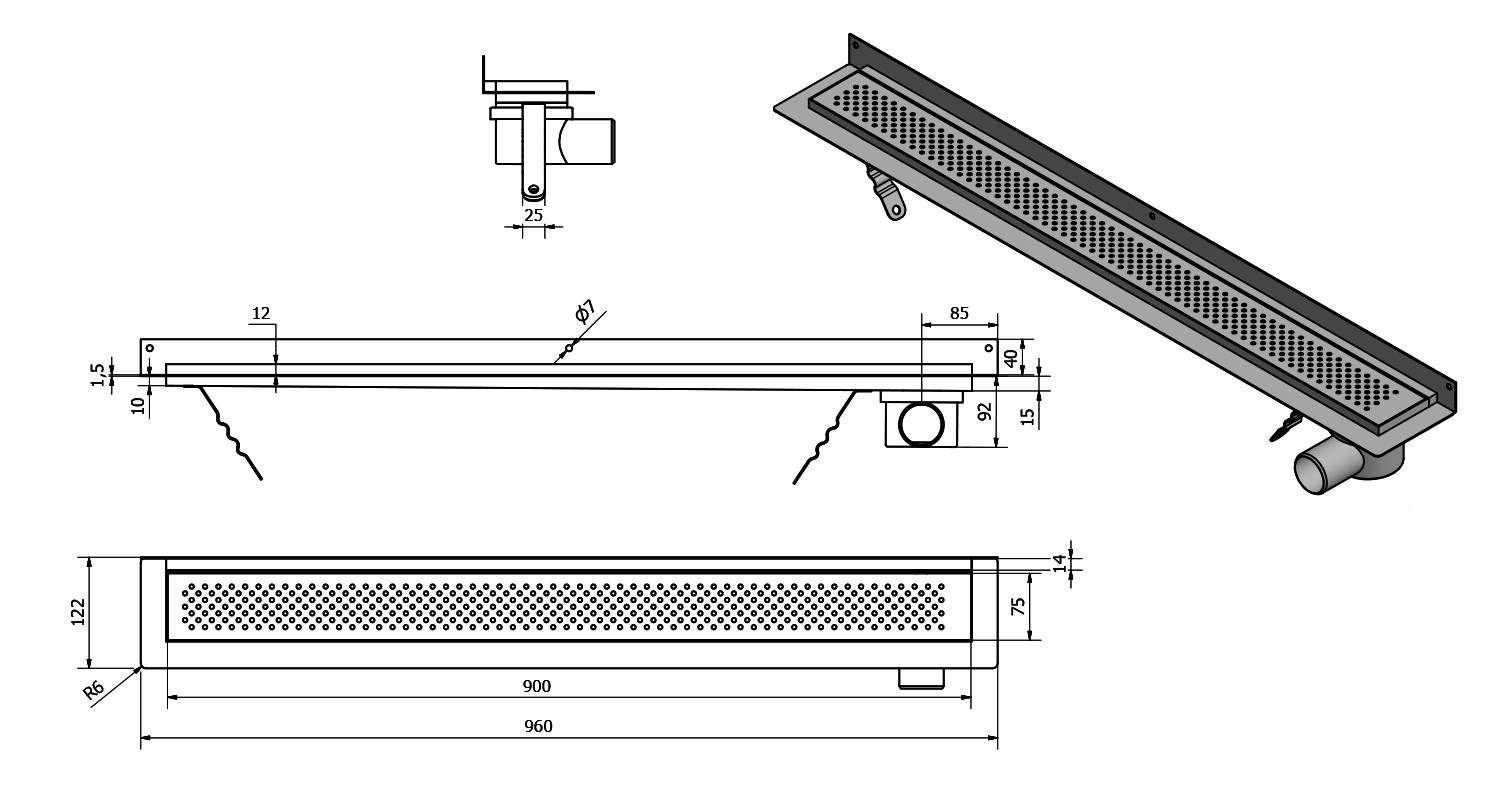 Ohýbatelné nohy, lem pro napojení hydroizolace Odtokový průtok 48 l/min Sifon 2705-FP je součástí dodávkyOdtokový žlab slouží k odvodnění podlahových ploch uvnitř budov, zejména sprchových koutů a koupelen. Ve sprchových koutech nahrazuje vaničku nebo podlahovou vpusť. Toto řešení umožňuje neomezenou velikost sprchového koutu, sladěný vzhled koupelny, jednoúrovňovou podlahu v celé koupelně a možnost použití podlahového vytápění.