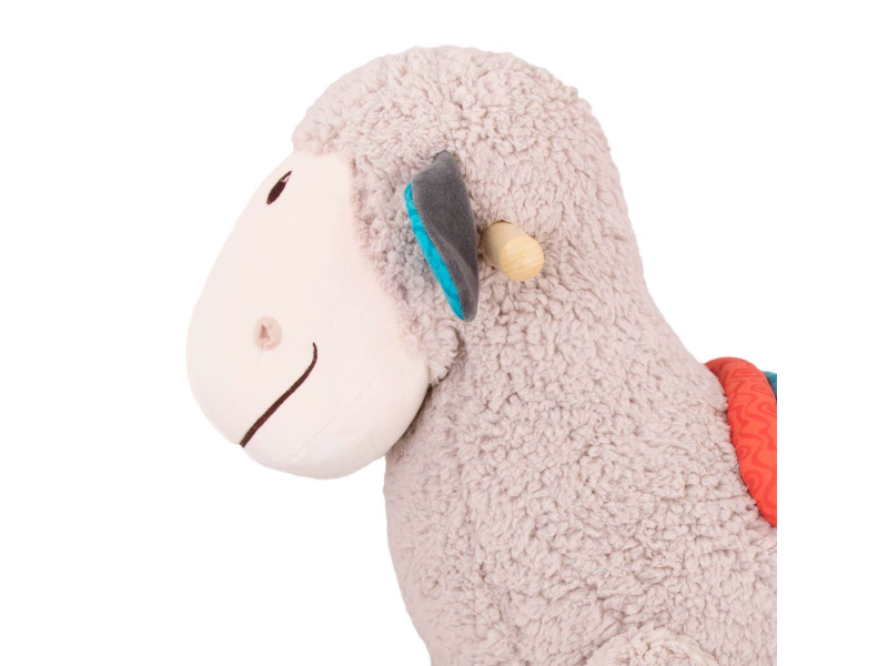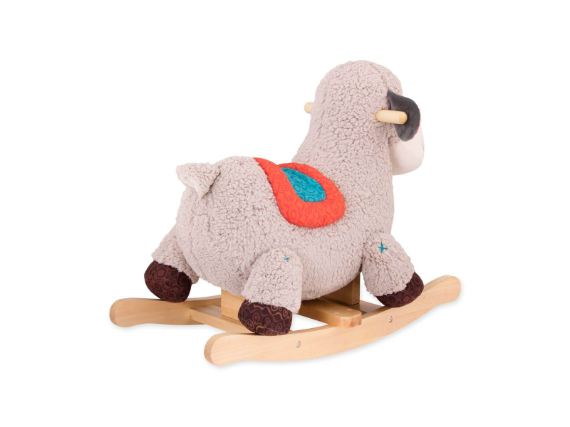 Roztomilá plyšová houpací ovečka s dřevěnou základnou a držadly je hračkou, která láká k houpání i k pohlazení.