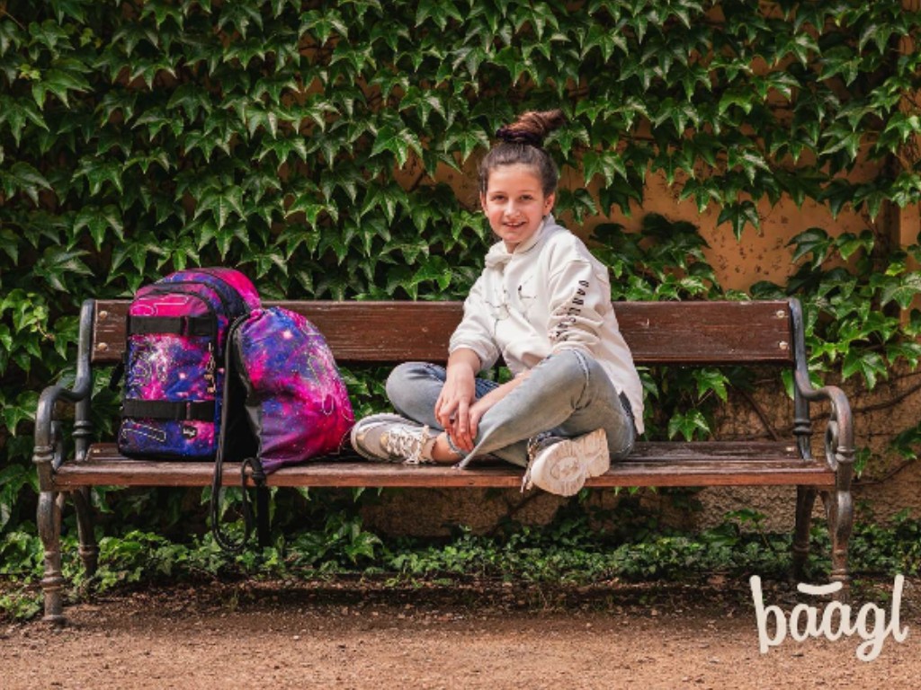 Stahovací textilní pytlík na přezůvky s motivem galaxie mohou školačky díky pevným tkanicím využít také jako batůžek a uložit do něho například vybavení na tělocvik nebo různé volnočasové aktivity. Pevný omyvatelný materiál usnadní jeho čištění.
