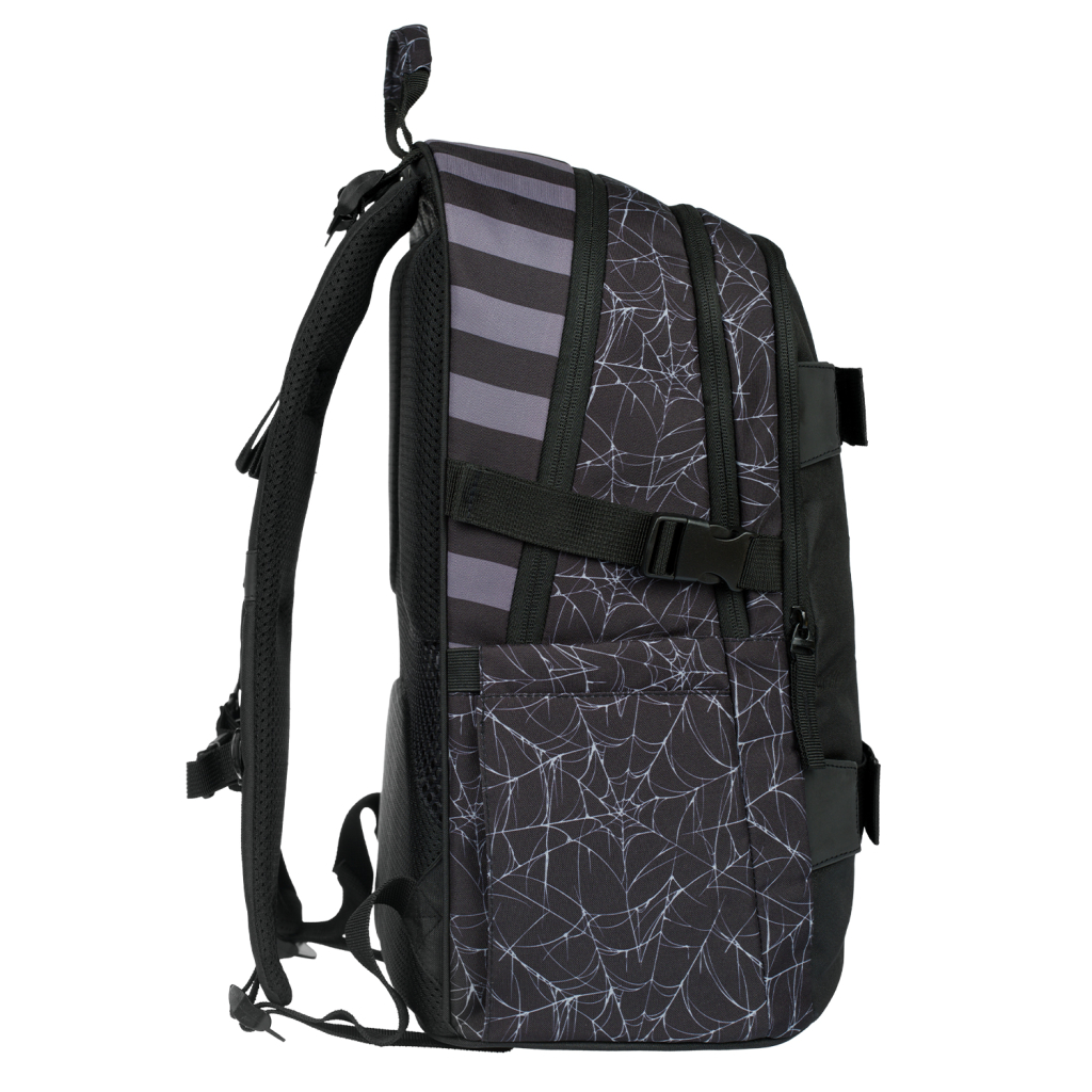 Ultralehký batoh Skate v designu oblíbeného seriálu, v černé barvě s motivem pavučin, je vhodný pro dívky od 3. třídy. Samozřejmě ho využijí i na druhém stupni základní školy. Batoh s tvarovanými zády splňuje nejvyšší nároky na ergonomii a zdravý vývoj dětí. Zásluhou plně nastavitelných ramenních, prsních a bočních popruhů můžete batoh optimálně uzpůsobit každé postavě.
