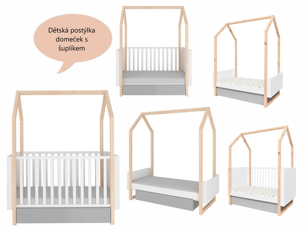 Originální dětská domečková postýlka s prostorným šuplíkem a možností předělání na dětskou postel o délce 160 cm poroste s vaší holčičkou i chlapcem. Kvalitní, výškově nastavitelná postýlka (možnost nastavit rám matrace do tří úrovní) se přizpůsobí vašim potřebám. V nejvyšší poloze je vhodná pro kojence, kteří ještě nejsou pohybově příliš aktivní, střední poloha pro sedící a lezoucí děti a ta nejnižší pro děti, které se zvládnou samostatně postavit. Po odstranění zábran zvládnou děti z postýlky pohodlně vylézt i do ní vlézt a po prodloužení se z ní stává dětská postel i pro větší děti. Postýlka i postel ve tvaru domečku není jen pohodlným místem pro kvalitní spánek a odpočinek, ale je i místem k zábavným a dobrodružným hrám. Rám postýlky můžete dozdobit nejrůznějšími závěsnými dekoracemi, lampiony i různými světýlky.