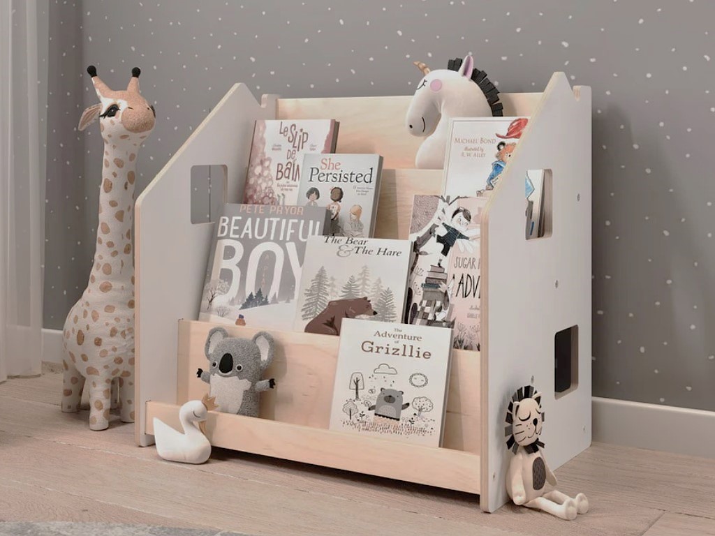 Oboustranná – z přední strany knihovny najdete schodovité police pro vystavení knih, ze zadní strany pak úložný prostor na hračky nebo dětské poklady.