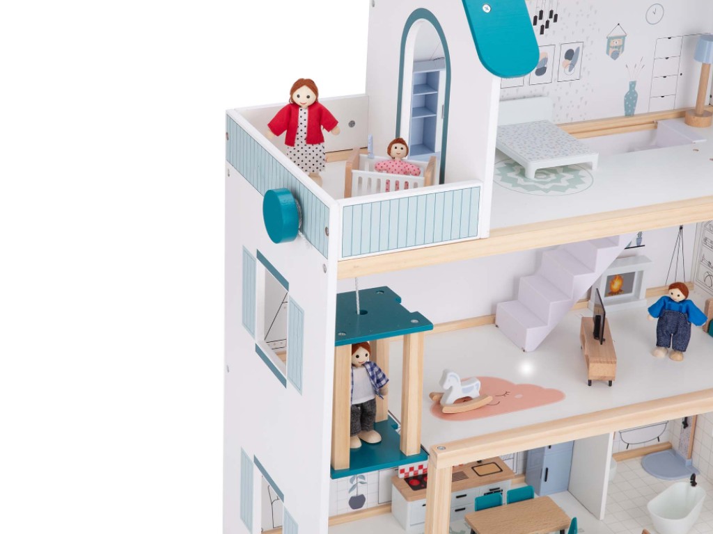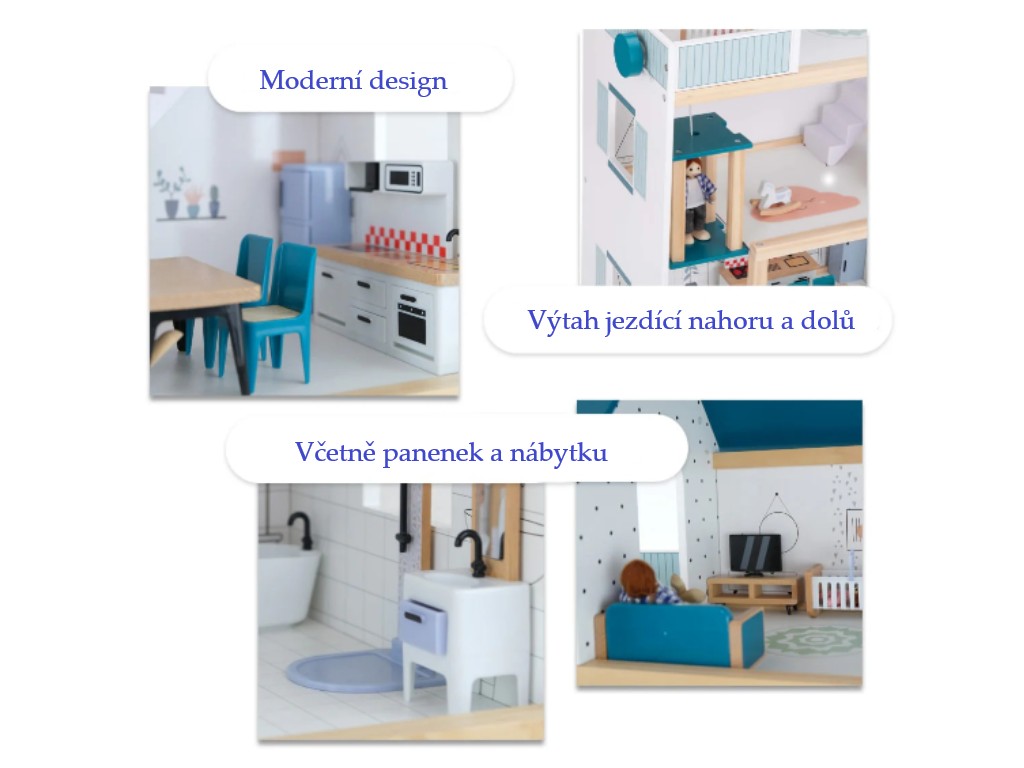 Dřevěný domeček s výtahem a bohatým příslušenstvím bude úžasnou hračkou nejen pro děti, ale jistě si s ním rádi pohrají i dospělí. Domeček nabízí tři patra, funkční manuálně ovládaný výtah a velmi bohaté příslušenství. V hracím domečku bydlí čtyřčlenná rodina panenek s pejskem a jejich království mohou děti vybavit nábytkem do kuchyně s jídelnou, do obývacího pokoje s krbem, do koupelny a také do ložnice. Nechybí ani vybavení pro miminko. Všichni si mohou užít také pobyt na prostorném balkoně. Obytné místnosti hracího domečku jsou díky otevřené přední straně snadno přístupné.