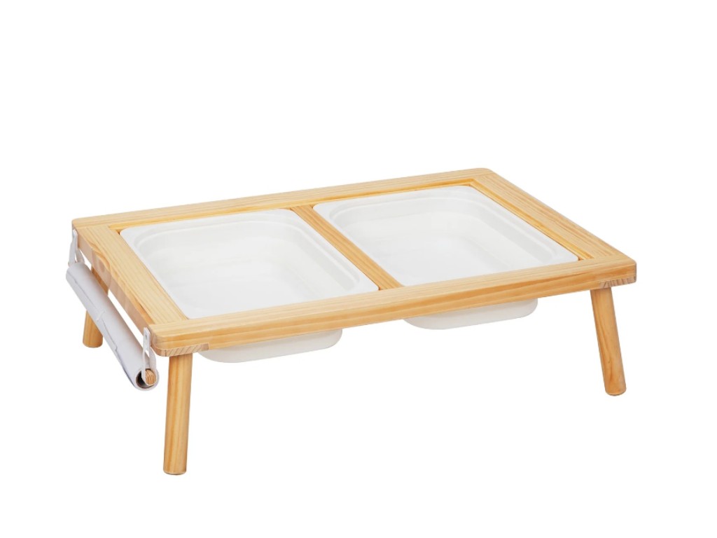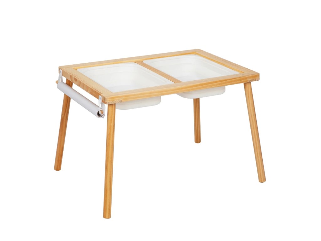 Pod deskami stolu se po jejich zvednutí ukrývají dva plastové boxy pro uložení psacích i výtvarných potřeb, autíček, lega nebo dalších dětských pokladů. Úložné kontejnery je možné nastavit do menší či větší hloubky. Součástí stolu je držák na roli papíru o šířce až 50 cm, děti tedy mohou malovat a kreslit celé hodiny bez omezení – s dostatkem prostoru pro velkoformátové tvoření i společné malování.