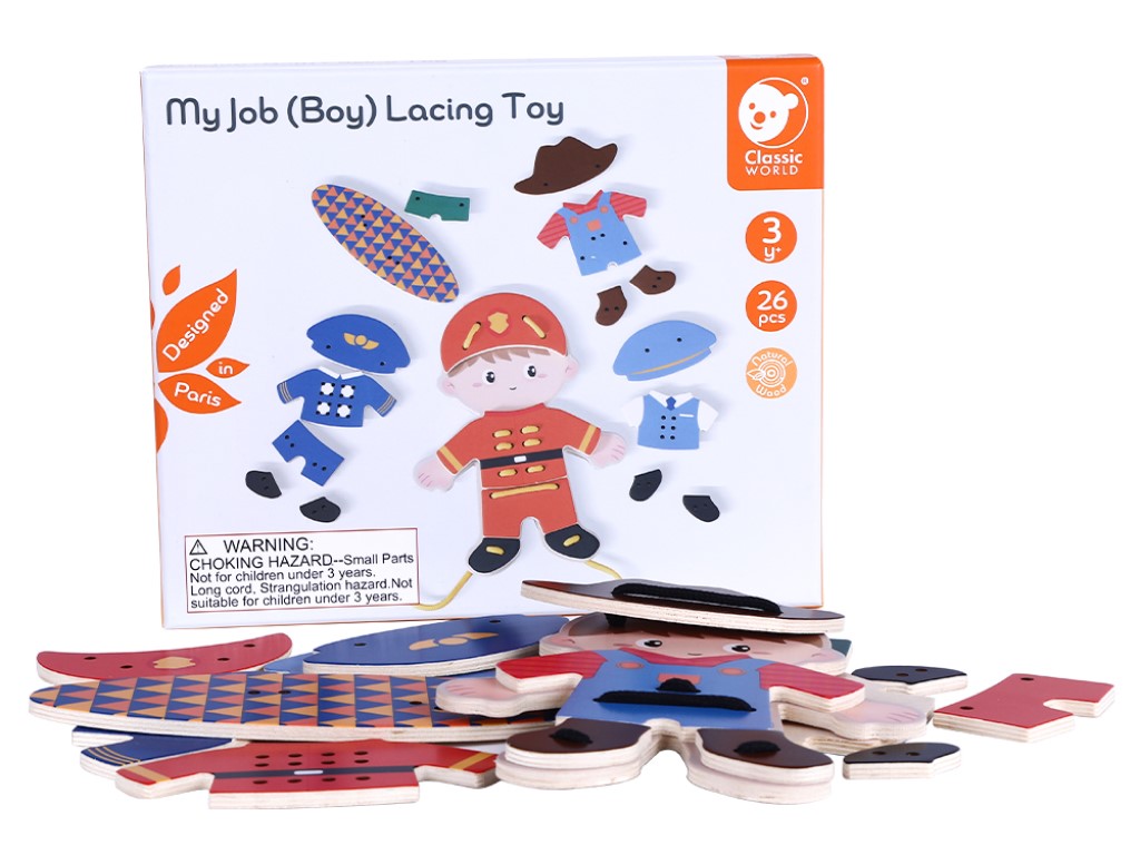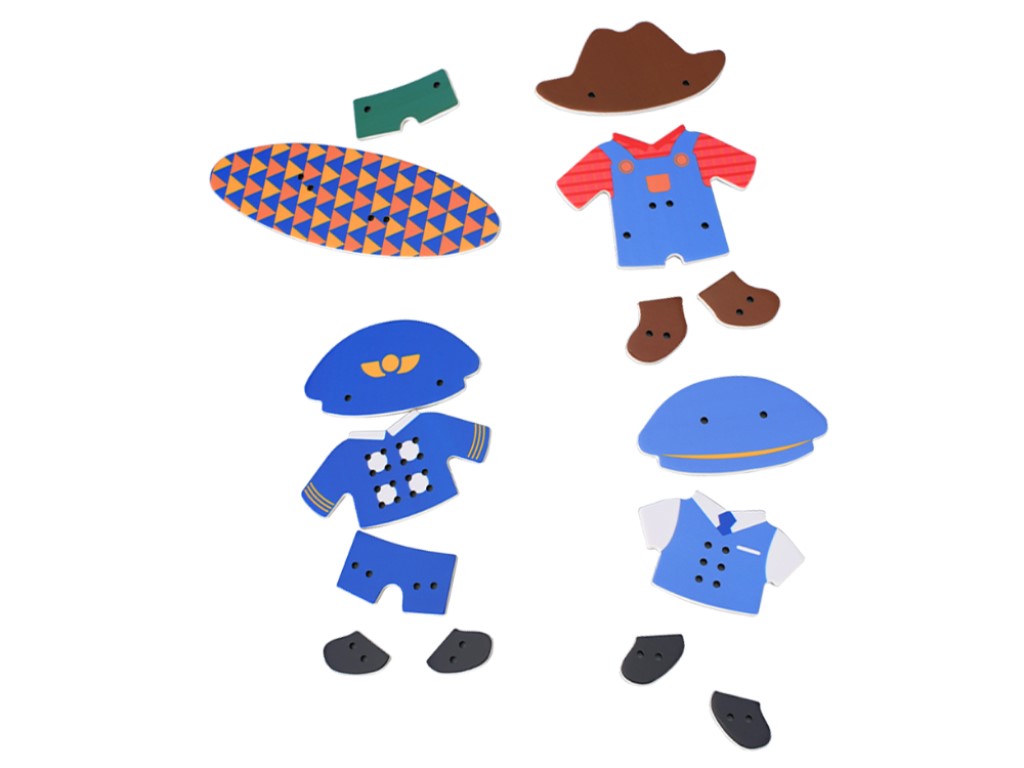 Oblečte postavičky z různých profesí do uniformy nebo do různých kombinací oblečení. Děti si mohou ze sad oblečení vybrat jen určité puzzle dílky a navrhnout svou vlastní kombinaci. V každém puzzle dílku jsou navíc připravené otvory pro provlékání a šněrování provázku. S tímto originálním puzzle se děti seznámí s profesemi, zdokonalí logické myšlení, rozvíjí kreativitu a fantazii a díky možnosti provlékání potrénují jemnou motoriku, koordinaci očí a rukou, učí se soustředit se a trpělivosti.