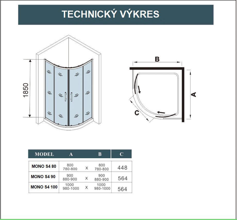 Čtvrtkruhová sprchová zástěna MONO S4 90 čiré sklo, R550