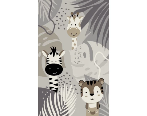Roztomilý koberec 120×170 cm s motivem veselých zvířátek z džungle na šedém podkladu vytvoří hravé a klidné prostředí v každém dětském pokoji.