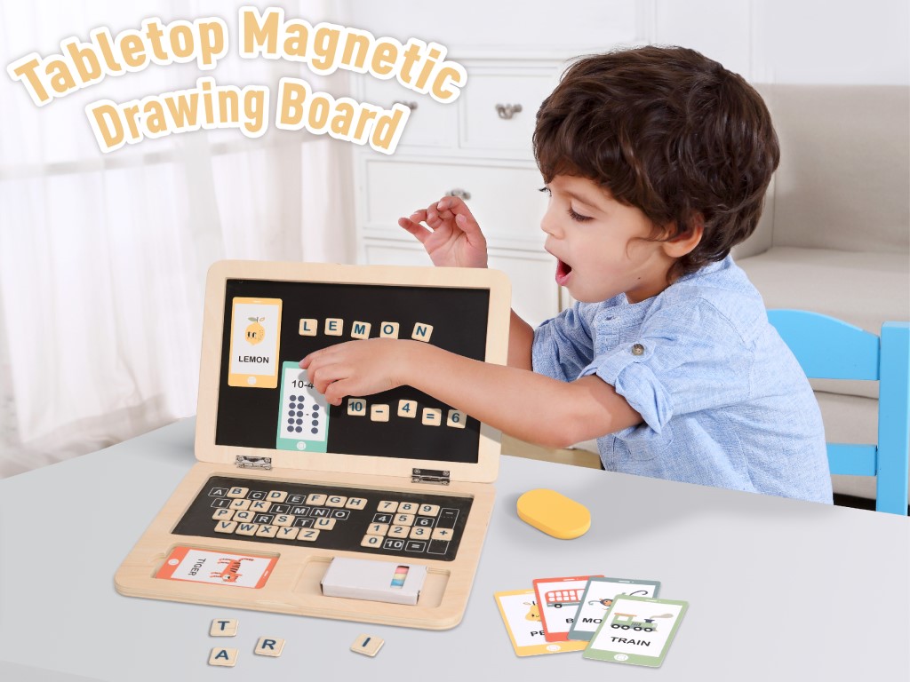 Dřevěná vzdělávací hračka v podobě dětského notebooku přinese dětem spoustu zábavy a naučí je i něco nového. Součástí dětského notebooku jsou barevné křídy ke kreslení a psaní na displej počítače, houbička na mytí displeje, klávesnice s písmenky, čísly a znaménky, herní kartičky s početními úlohami, s obrázky zvířátek a jejich anglickými názvy. S notebookem se děti budou cítit dospěle, mohou napodobovat práci na počítači, mohou si hrát a vzdělávat se.