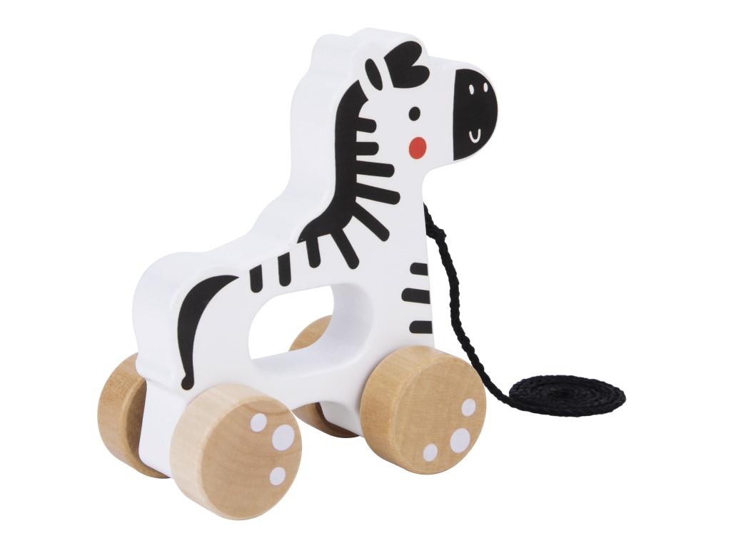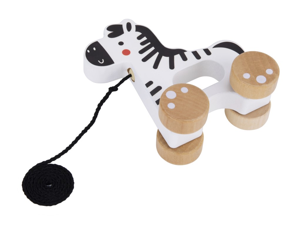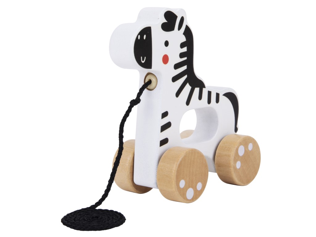 Dřevěná tahací hračka v podobě roztomilého proužkovaného zvířátka – zebry, je zábavnou hračkou, která motivuje děti k pohybu a zdokonaluje motorické dovednosti. Stačí uchopit konec provázku a vyrazit s proužkovaným koníkem na kolečkách na procházku po domě či bytě. Děti svému věrnému zvířecímu kamarádovi mohou ukázat pokojíček, kam se chodí najíst, kde si čistí zoubky a za sucha klidně i zahradu.