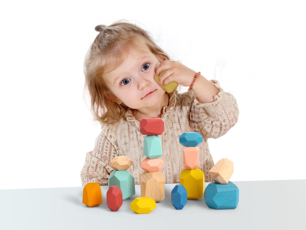 Dřevěné kameny představují zábavnou balanční a stohovací hru pro celou rodinu. Barevné dřevěné kameny různé velikosti, různých barev a různých nepravidelných tvarů, jsou určené ke stohování, ke skládání obrazců i věží. Postavit co nejvyšší věž je opravdovou výzvou a podaří se to jen tomu, kdo správně uspořádá a pootočí kameny. K tomu všemu je potřeba přidat trochu trpělivosti a soustředit se. Při hře s dřevěnými kameny se děti učí poznávat barvičky, zdokonalují motorické dovednosti, koordinaci očí a rukou, prostorové vnímání a představivost, logické myšlení, učí se soustředit se chvíli na jedu činnost, trpělivosti.