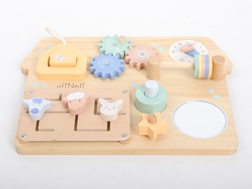 Dřevěný activity board ve tvaru domečku, se spoustou hracích prvků představuje hned několik hraček v jedné. Hrací prvky v krásných pastelových barvách, zvířátka z farmy a celkový design láká děti k pečlivému prozkoumání, při kterém přirozeným způsobem zdokonalí své dovednosti a naučí se něčemu novému. Activity board pro děti již od 1 roku si pro ty nejmenší připravil ozubená kola, mini počítadlo, nasazovací tvary, bludiště se zvířátky, domeček, zrcátko a pro ty největší šikulky i hodiny. Při hře s activity boardem děti prostřednictvím hry zdokonalují motorické dovednosti, koordinaci očí a rukou, logické myšlení, manuální zručnost, rozvíjí svou představivost, učí se poznávat barvičky, tvary, zvířátka z farmy, seznamují se s počty a plynutím času.