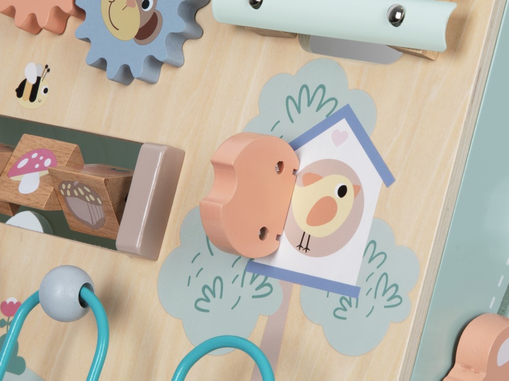 Zábavné aktivity – vkládačka, dráha pro autíčka s autíčky, korálkové bludiště, 3 barevná ozubená kolečka se zvířátky, otáčecí kostky, otvírací dvířka, barevný xylofon s paličkou.