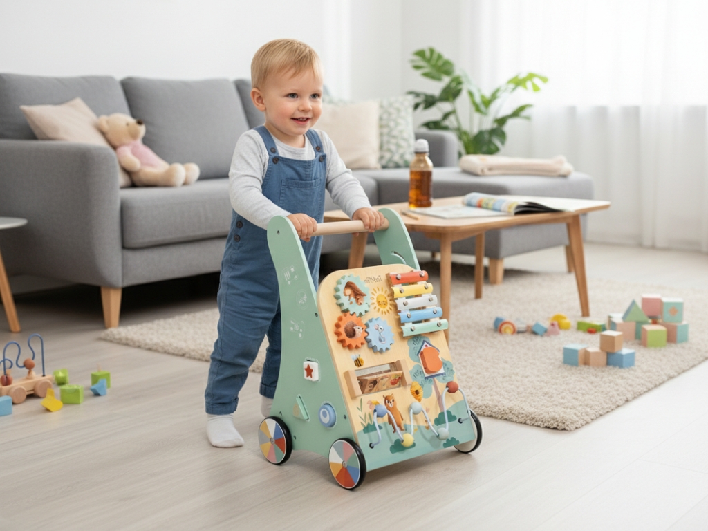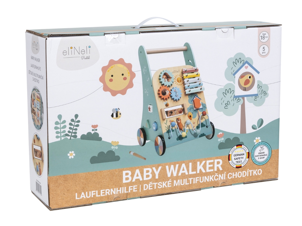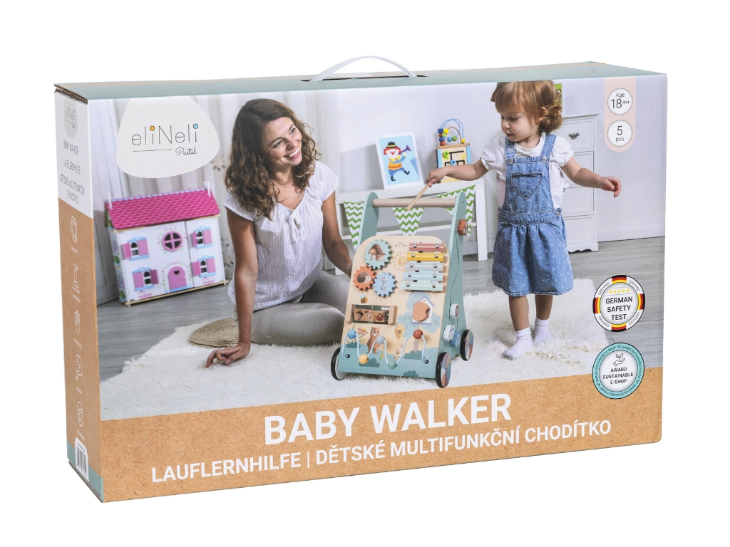 Multifunkční design pro rozvoj dětíPodporuje motorické dovednostiChodítko pro děti kombinuje podporu samostatné chůze s bohatými hracími prvky, díky kterým si děti hrají, učí se a objevují svět kolem sebe. Oblíbená otočná kolečka, posunovací korálky, otvírací dvířka a vkládačky stimulují koordinaci očí a rukou a rozvíjejí jemnou i hrubou motoriku.Přední strana chodítka nabízí xylofon, který děti baví a zároveň pomáhá rozvíjet rytmus, hudební sluch a kreativitu. Hra s chodítkem podporuje logické myšlení, trpělivost a soustředění při objevování nových aktivit.Přírodní materiály a bezpečnostBezpečná hračka pro vaše dítěChodítko je vyrobeno z přírodního dřeva a natřeno netoxickými, vodou ředitelnými barvami, takže je bezpečné i pro nejmenší děti.Kolečka jsou potažena gumou, která zabraňuje uklouznutí,chrání podlahu před poškrábáním a zároveň tlumí zvuk při jízdě, což chodítko činí ideální pro domácí použití.Technické parametryRozměry32,5 x 32,8 x 47,5 cmRozměry balení52,5 x 13,5 x 34 cmHmotnost3,35 kgHmotnost balení3,82 kgMateriálpřekližka, bukové dřevo, MDF, jalovcové dřevo, kovCertifikátyEN71-1,2,3, CE, 2009/48/ESDoporučený věkod 18m, 18m+Výhody produktuBarevné motivy se zvířátky motivují děti k objevování a podporují kreativitu, soustředění a fantazii při každodenní hře. Chodítko zároveň pomáhá dětem se samostatnou chůzí a rozvíjí jemnou i hrubou motoriku. Integrované aktivity, jako vkládačka, dráha s autíčky či xylofon, stimulují logické myšlení, koordinaci očí a rukou a učí děti trpělivosti. Přírodní materiály a netoxické barvy zajišťují bezpečnou hru, zatímco gumová kolečka chrání podlahu a tlumí zvuk při jízdě. Výhody produktu Přírodní materiály Chodítko je vyrobeno z přírodního dřeva, což zajišťuje bezpečnost a ekologičnost. Multifunkční design Kombinuje chodítko a zábavnou hračku s aktivitami, což poskytuje mnohostrannou zábavu. Zábavné aktivity Obsahuje vkládačku, dráhu pro autíčka, korálkové bludiště a další prvky. Vzdělávací pomůcka Učí děti poznávat zvířátka, počítat a hrát na hudební nástroj. Bezpečnost pro děti Vyrobeno z netoxických materiálů a opatřeno gumovými kolečky pro ochranu podlahy. Rozvoj motoriky Podporuje rozvoj jemné a hrubé motoriky prostřednictvím různorodých aktivit. My v ELIS DESIGN jsme sami rodiče dětí různého věku a záleží nám na tom, s čím si hrají. Proto i pro vaše děti vytváříme a vybíráme smysluplné hračky z kvalitních, nejlépe přírodních, materiálů, inspirované montessori, které nejen zabaví, ale i rozvíjí. Je chodítko vhodné pro všechny podlahy? Ano, kolečka jsou opatřena gumou, která chrání podlahu před poškrábáním. Z jakého materiálu je chodítko vyrobeno? Chodítko je vyrobeno z překližky, bukového a jalovcového dřeva, MDF a kovu. Pro jaký věk je chodítko určeno? Chodítko je vhodné pro děti od 18 měsíců. Více o produktech eliNeli https://www.elineli.eu/cz/