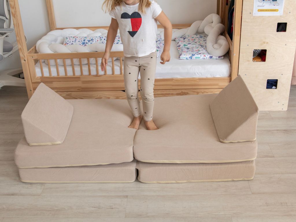 Rozkládací a úžasně multifunkční pohovka, v neutrální béžové barvě, je parádním doplňkem do každého interiéru. Pohodlná pohovka se jednoduchým přemístěním jednotlivých dílů snadno promění v křeslo, puf, matraci, bunkr, domeček, překážkovou dráhu, zkrátka záleží jen na dětské fantazii a aktuálních potřebách, v co tuto úžasnou sedačku promění a kolik dílů k tomu použijí. Děti milují bunkry, nejrůznější schovky a domečky, tímto vším může tento dětský nábytek být. Pohovka, ať už rozložená nebo složená, nabídne dětem pohodlí při lenošení a nabízí spoustu možností ke hře. Potah každého dílu sedačky je opatřený zipem, aby bylo možné potah v případě potřeby sejmout a vyčistit.