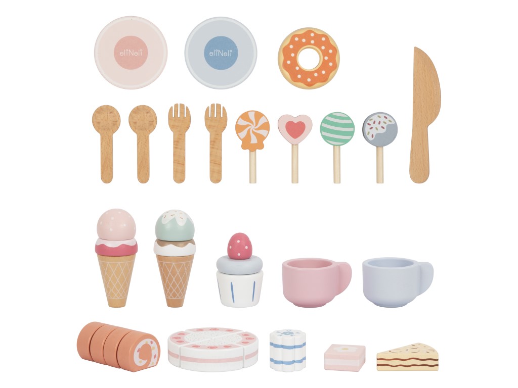 Dětská čajová sada s lahodně vypadajícím dortem, dezerty a cukrovinkami, vše uložené v praktickém boxu, obsahuje vše, co je pro uspořádání čajového dýchánku nebo k odpolední kávě potřeba. Box ukrývá dřevěné šálky s podšálky a lžičkami, krájecí dort s destičkou a dřevěným nožem, dezerty, lízátka i kornoutky se zmrzlinou. Tato sladká hostina probudí chuťové pohárky u dětí i dospěláků. Nejedná se však o potraviny určené ke konzumaci, ale o dřevěné hračky, které jsou skvělým doplňkem do dětské kuchyňky nebo do dětského obchůdku. Díky boxu (kyblíku) je celá sada snadno přenosná a rychle uklizená.