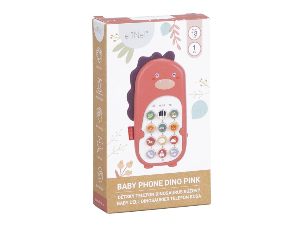 Růžový dětský telefon (mobil) v podobě dinosaura je vybavený 12 obrázkovými tlačítky s různými funkcemi. Růžový mobilní telefon děti zabaví, zahraje jim písničku a ještě je naučí pár anglických slovíček a výrazů: