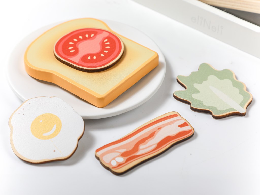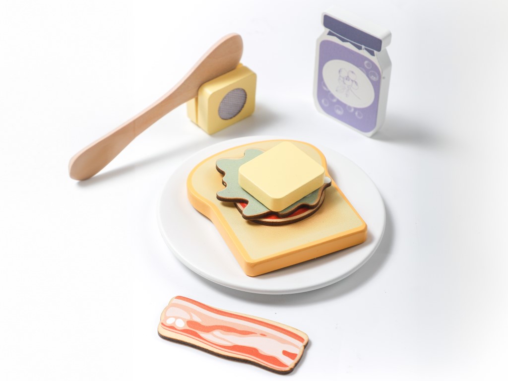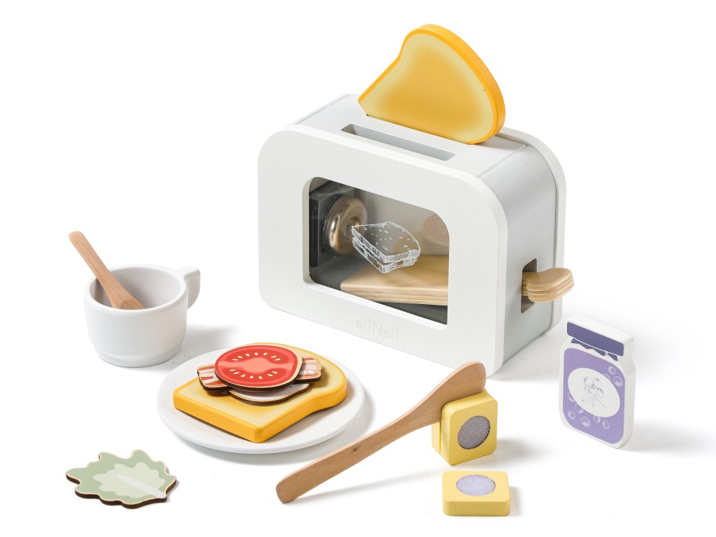 Dětský toustovač v jedinečném designu a barevně neutrálním skandinávském stylu, v setu s příslušenstvím, vyrobený z kvalitního přírodního dřeva, nesmí chybět v žádné dětské kuchyňce ani obchůdku. S dřevěným topinkovačem děti připraví křupavé tousty s máslem, s džemem nebo slaninou, které pak mohou servírovat na snídani svým oblíbeným panenkám, plyšákům nebo rodičům přímo do postele. Dřevěný toustovač v neutrální bílé barvě s průhlednou boční stranou je edukativní hračkou, která umožňuje dětem napodobovat dospělácké činnosti bezpečným dětským způsobem. Děti si vyzkouší ovládání topinkovače, chystání snídaně – toustů na sladko i naslano. Balení obsahuje dřevěný toustovač i další dřevěné příslušenství – talíř, šálek, lžičku, nůž, krájecí máslo, džem, 2 tousty, volské oko, plátek slaniny, rajčete a salátový list.