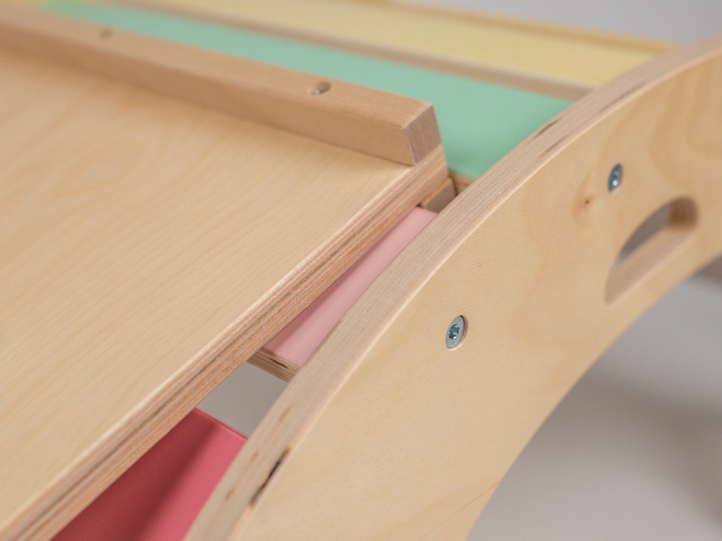 Vytvořte malé dětské hřiště přímo u vás doma, snadno a rychle. Stačí vám k tomu tento úžasný fresh set dřevěné houpačky 5v1 s oboustranným prknem – z jedné strany skluzavka, z druhé strany lezecká deska. Dřevěná houpačka, v barevné kombinaci přírodního dřeva a svěžích fresh barev, je multifunkční hračkou do dětského pokoje, kterou děti využijí samostatně nejen při pohybových hrách. Na montessori houpačce se mohou děti houpat nebo jen příjemně relaxovat za mírného pohupování. Pro maximální pohodlí doplňte houpačku měkkým potahem. Houpačka skvěle poslouží jako prolézačka, skluzavka do interiéru. Děti ji mohou přelézat, podlézat, schovat se pod ni, klouzat se po ní, posadit se na ni nebo si lehnout. Při dětských hrách může být mostem, tunelem, domečkem i prodejním pultem. Při propojení s oboustranným prknem se snadno promění v dětské hřiště, které umožní dětem klouzat se nebo šplhat po straně s lezeckými úchyty. S fresh setem dřevěné houpačky a prkna si děti užijí spoustu legrace, rozhýbou celé tělo, posílí svaly, zdokonalí své motorické schopnosti.