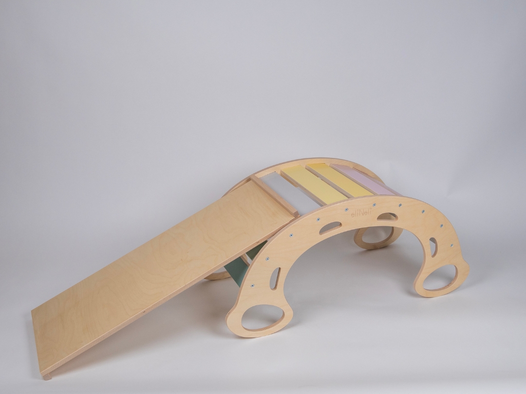 Oboustranné prkno – prkno, které je součástí setu, umožní dětem sportovat i bavit se. Z jedné strany představuje zábavnou skluzavku, z druhé strany lezeckou stěnu pro šplhání. Úchyty v pastelových barvách potrénují prstíky a posílí svaly.