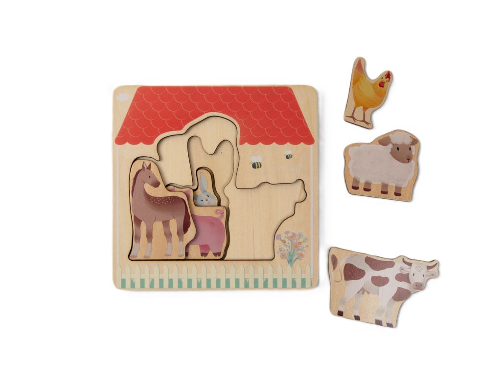 Dřevěné puzzle se zvířátky z farmy je netradiční dětské puzzle, které se skládá v několika vrstvách. Zvířátka, která mohou děti vidět ve svém okolí, vyobrazená v jejich skutečné, reálné podobě, si pro děti připravila zábavnou skládačku a vkládačku, která dokonale potrénuje dětské prstíky a nejen ty. Při vkládání zvířátek do domečku se děti učí poznávat zvířátka, která mohou vidět na farmě, na statku, ve městě i na venkově, zdokonalují motorické dovednosti, koordinaci očí a rukou, prostorovou představivost. Hra se zvířátky navíc podporuje dětskou fantazii, učí děti soustředit se a trpělivosti, protože bez toho to někdy nejde. Díky přírodnímu provedení a krásným barvám je vícevrstvé puzzle vhodné pro holčičky i kluky.