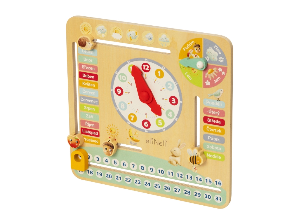 Unikátní design a kvalitaJedinečný vzhled pro každý dětský pokojDřevěný kalendář s hodinami přináší kombinaci přírodního dřeva a pestrých barev, která se dokonale hodí do každého dětského pokoje. Vyrobený je z kvalitních materiálů, nabízí nejen estetický zážitek, ale také dlouhou životnost a odolnost.Tento kalendář se stane nejen vzdělávací hračkou, ale i krásnou dekorací, která zaujme svou originalitou a provedením. Díky použití netoxických, vodou ředitelných barev je zcela bezpečný pro každodenní hru.Vzdělávací hodnotaUčení hrou pro malé průzkumníkyKalendář dětem zábavnou formou představuje dny v týdnu, měsíce a roční období. Veselá zvířátka a přírodní motivy pomáhají dětem rozpoznávat jednotlivé části roku, rozvíjet vědomosti a učit se orientovat v čase s pomocí velkých hodin a červených ručiček.Pohyblivé prvky, jako včelička označující aktuální den, ježeček sledující počasí nebo žalud ukazující den a noc, zapojují děti aktivně do učení. Kalendář podporuje jemnou motoriku a kognitivní schopnosti, takže zábava a vzdělávání probíhají zároveň.Bezpečnost a ekologieBezpečné a ekologické materiályKalendář je vyroben z přírodního dřeva a natřen netoxickými, vodou ředitelnými barvami. Tyto materiály jsou bezpečné pro děti a šetrné k životnímu prostředí.Bezpečnostní standardy jsou prioritou, proto je kalendář certifikován pro děti od 3 let. Poskytuje nejen zábavu a vzdělávání, ale také jistotu, že je vaše dítě v bezpečí.Technické parametryRozměry3,5 x 29,5 x 29,5 cmRozměry balení4 x 30,2 x 30,2 cmHmotnostcca 0,5 kgHmotnost balení0,6 kgMateriálPřekližka, jalovcové dřevo, plast
