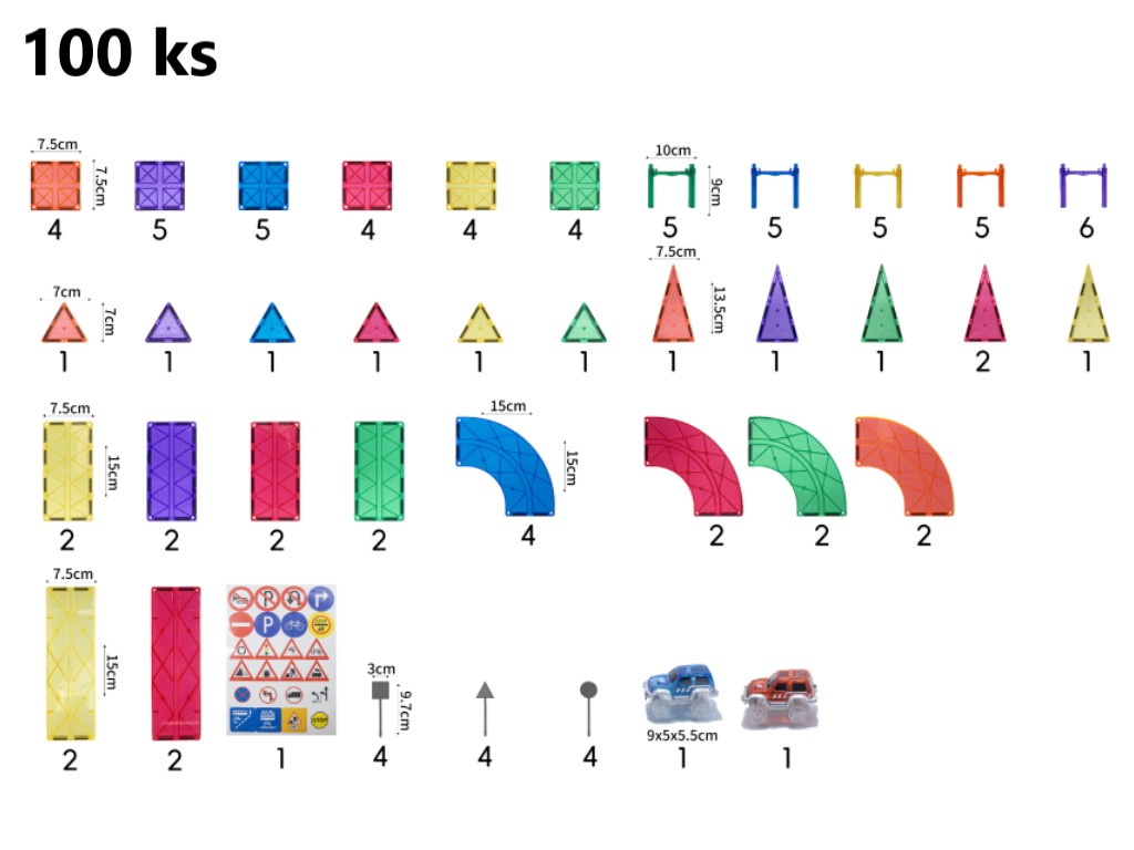 Obsah balení: 100 ks (26x čtverec, 8x obdélník, 6x rovnoramenný trojúhelník, 6x rovnostranný trojúhelník, 4x svah, 10x zatáčka, 26x sloupy, 2x auto, 12x značka).