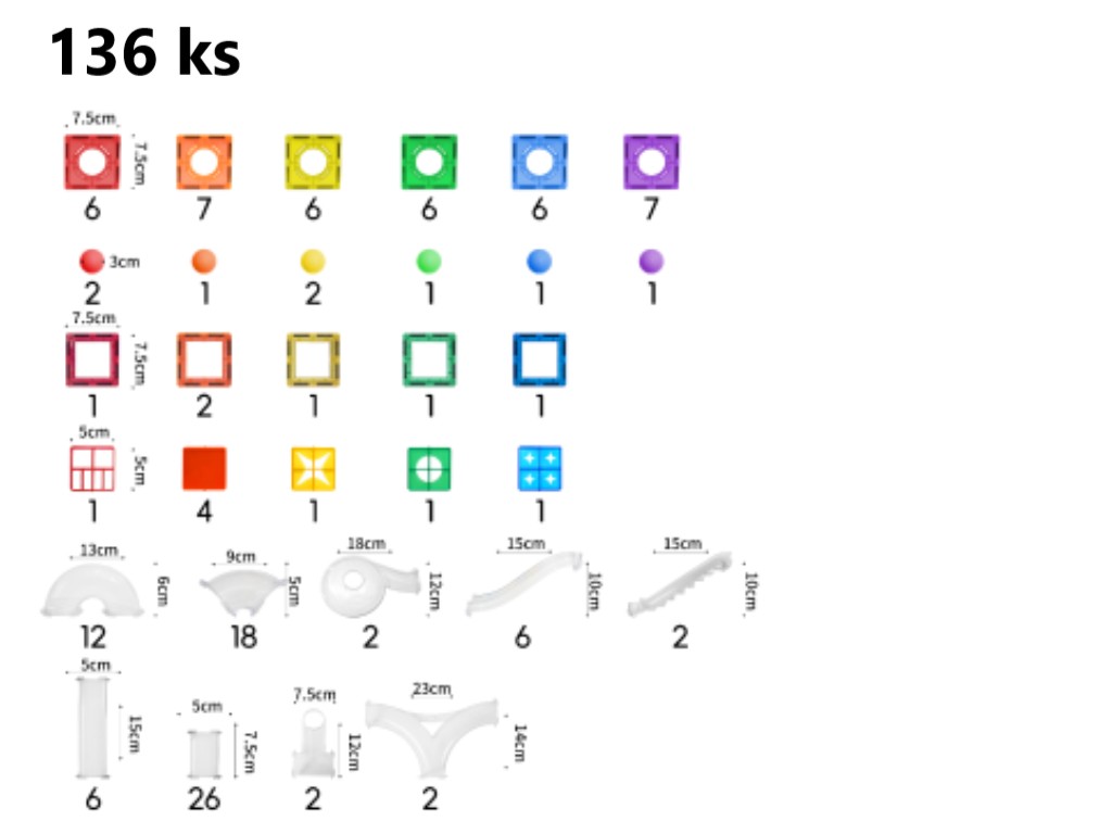 Rozměry dílků: čtverec malý 7,5 x 7,5 cm, tunel rovný 5 x 15 cm (rozměry najdete v galerii fotografií).