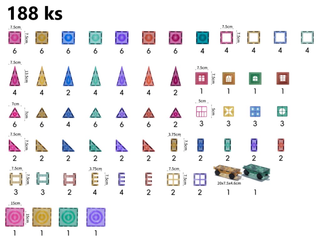 Obsah balení: 188 ks (46x malý čtverec, 4x velký čtverec, 10x obdélník, 36x malý rovnostranný trojúhelník, 12x pravoúhlý trojúhelník, 24x dlouhý rovnoramenný trojúhelník, 16x okno, 4x okno s mřížkou, 4x okenní klip, 12x okenní klip s mřížkou, 10x plot, 8x tvar písmena H, 2x podvozek).