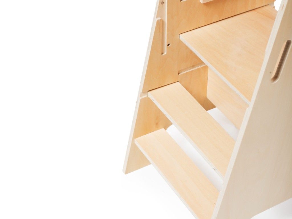 Neutrální barevné provedení – učící věž vyrobená z překližky, ošetřená vodou ředitelným lakem, je praktickým pomocníkem i krásným kouskem dětského nábytku do domácnosti.