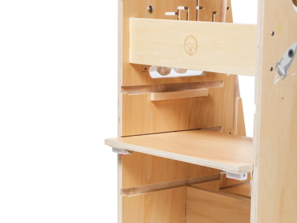 Set dětského nábytku (stoleček + židlička) – stačí učící věž položit zadní stranou na podlahu a rázem se promění v praktický set dětského nábytku. Přesunutím plošiny, na které vaše dítko v učící věži stojí, vytvoříte stoleček, kde děti mohou posvačit, vyrábět a tvořit.