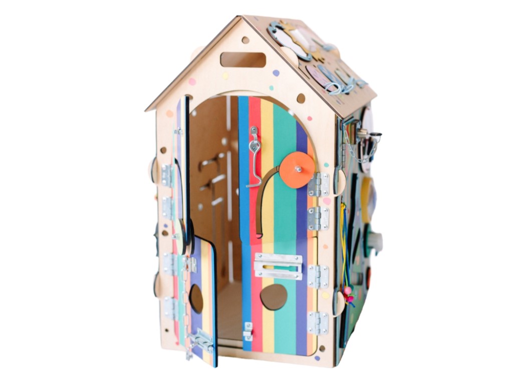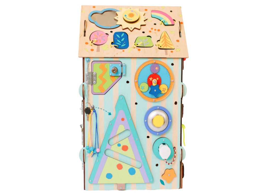 Montessori prvky na activity board domečku umožňují dětem všestranně se rozvíjet díky své přirozené zvídavosti.