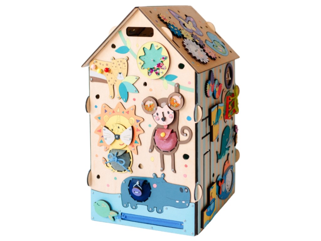 Activity board domeček ZOO je složen ze šesti desek s hracími a montessori prvky zaměřenými na zručnost, logiku, kreativitu a trpělivost. Domeček vtáhne děti do světa objevování a fantazie, kde si děti samy hrají a učí se tím nejpřirozenějším způsobem, pomocí hry.