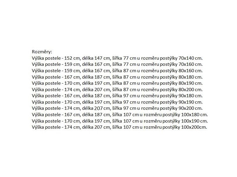 Rozměry: Postel je o 7 cm širší a o 7 cm delší, než vybraný rozměr lůžka (přesné rozměry v galerii obrázků).