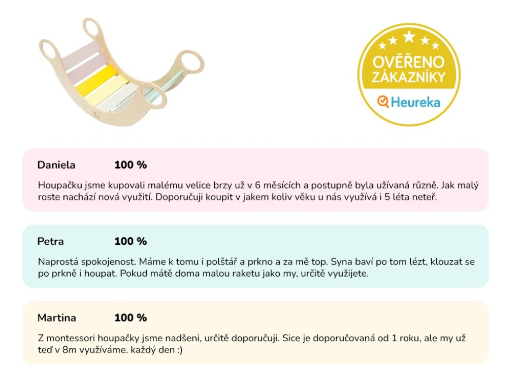 Neokoukané, moderně jednoduché provedení, přírodní dřevo a jemné pastelové barvy (v případě barevné varianty) propůjčují Montessori houpačce light zejména v dětských očích kouzlo neobyčejnosti a zajímavosti. Tato hračka splní také úlohu stylového doplňku interiéru.