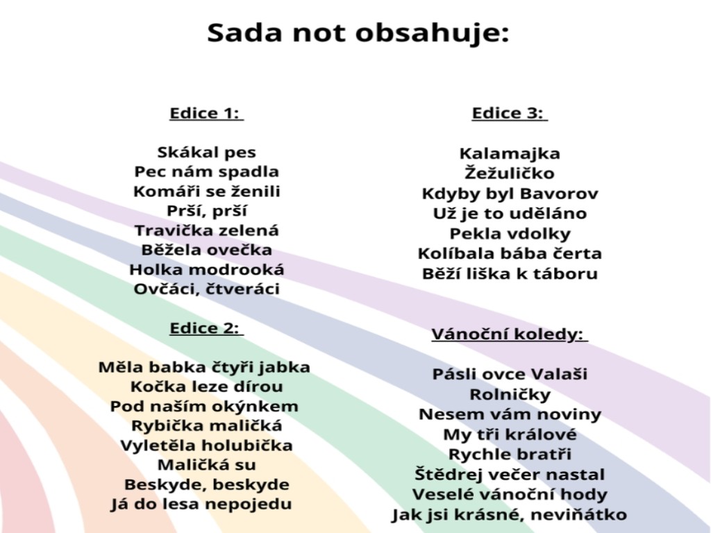 Perfektní pro malé i velké hudebníkyRozvoj kreativity a fantazieNoty pro Tambú, DingdangBú a XilaBú jsou navrženy tak, aby děti i dospělí mohli snadno a zábavně objevovat svět hudby. Barevné značení tónů pomáhá mladším a číselné označení je ideální pro starší hráče.Sada obsahuje 31 známých lidových písní a vánočních koled ve 4 edicích, které promění každou domácnost v místo plné melodií. Naučte se oblíbené písně jako Skákal pes, Travička zelená, Komáři se ženili, Pod naším okýnkem, Já do lesa nepojedu, Kalamajka, Nesem vám noviny nebo Štědrej večer nastal a uspořádejte doma vlastní rodinný koncert.Snadné použití doma i na cestáchIntuitivní a snadné hraníNoty jsou ideální pro všechny, kdo chtějí hrát kdykoliv a kdekoliv. Díky kompaktnímu formátu a praktické krabičce jsou snadno přenosné. Soubor notových sešitů je vytvořen tak, aby byl snadno srozumitelný pro všechny věkové skupiny. Díky barevnému a číselnému značení je učení hudby intuitivní a zábavné. Využijete ho pro více druhů hudebních nástrojů od značky Juegaconmigo.