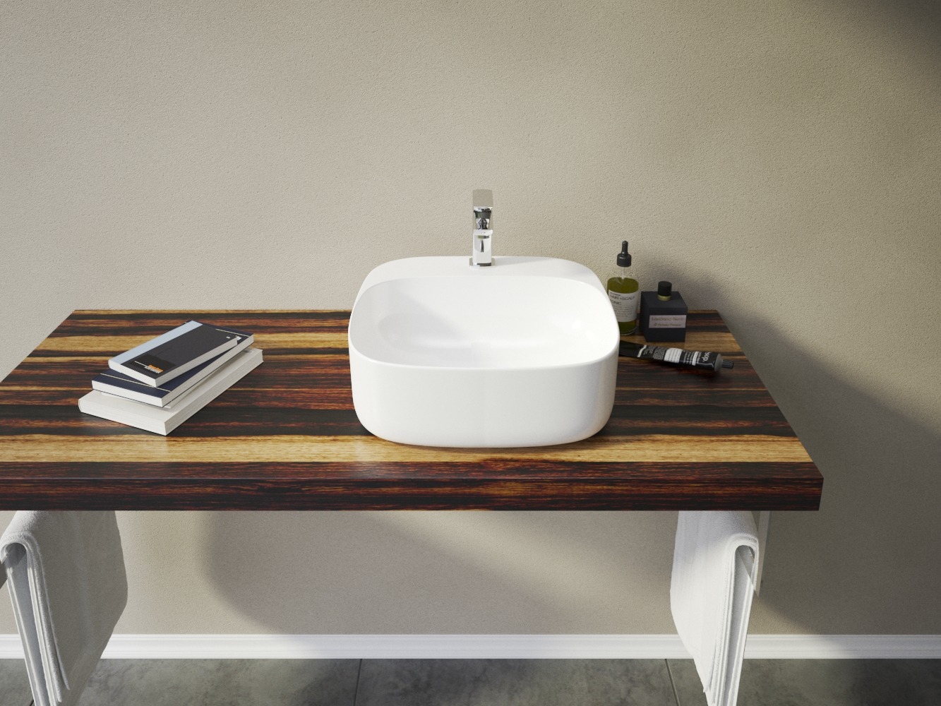 Popis otvor pro sifon: Ø 45 mm umyvadlo na desku bez přepadu s integrovaným blokem pro baterii šířka 42 cm výška 15,5 cm hloubka 42 cm Exclusivní kolekce italských keramických umyvadel