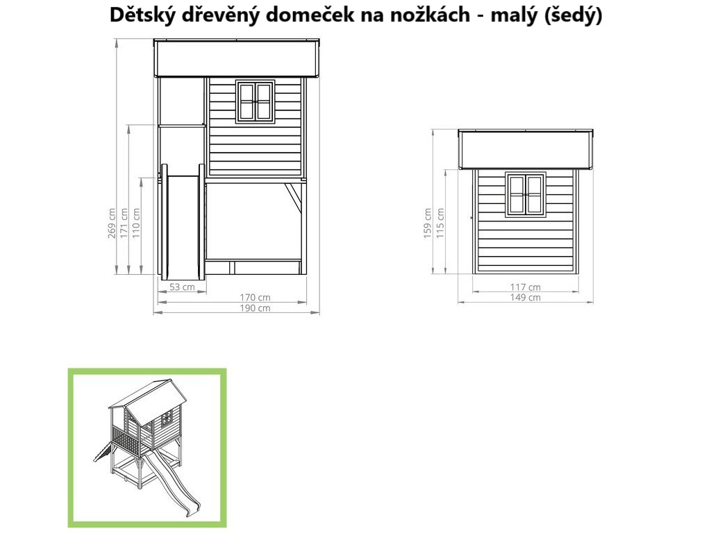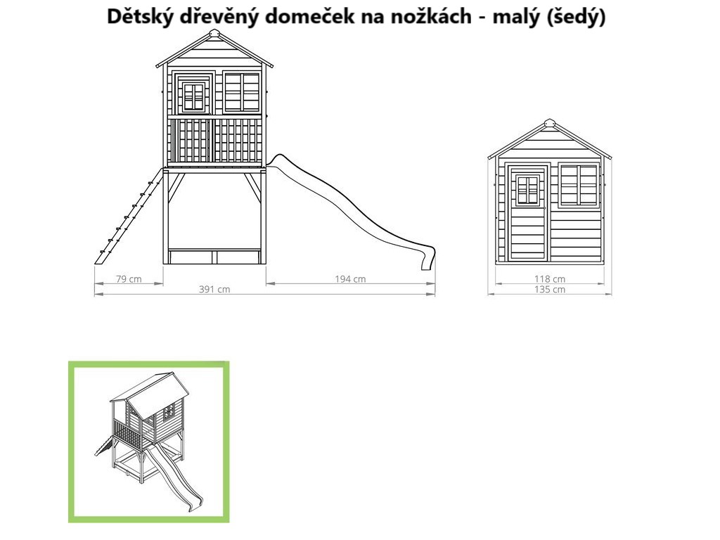 Zahradní dětský domeček na nožkách v neutrální šedé barvě s bílým lemováním okolo oken a dveří je vyrobený z certifikovaného cedrového dřeva. Cedrové dřevo se vyznačuje vysokou povětrnostní odolností, odolností proti vlhkosti a trouchnivění, neštěpí se, není nutné je ošetřovat nezdravými chemikáliemi, je tedy šetrné k životnímu prostředí a bezpečné pro děti. Díky menšímu rozměru je skvělou volbou pro malé i větší dvorky a zahrady. Děti si jej okamžitě zamilují. Najdou v něm svůj malý domov, s verandou, funkčními dveřmi, okny, střechou, která odolá i dešti. 2,4 m dlouhá zelená skluzavka a pískoviště ukryté pod domečkem zabaví vaše děti i jejich kamarády na dlouhé hodiny téměř za každého počasí.