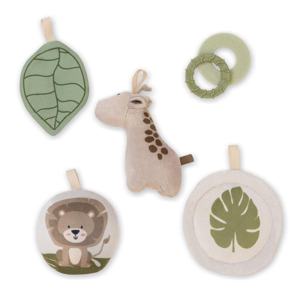 Balení obsahuje 4 hračky: zrcátko, plyšovou žirafu s chrastítkem, pískacího lvíčka a lístek ze šustivého materiálu.