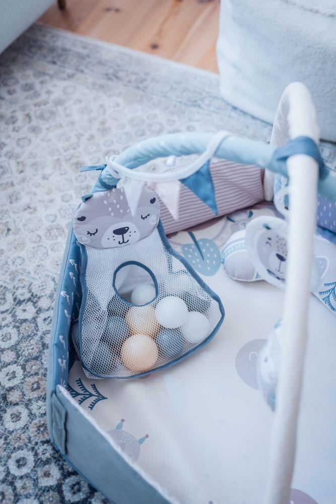 Podložka na hraní slouží také jako ohrádka. Stačí zvednout boční díly a vytvoříte bezpečný prostor pro miminko. Zabráníte tím nekontrolovatelným výletům a navíc se nerozkutálí míčky, které jsou také součástí příslušenství. Najdete je v samostatné síťce.