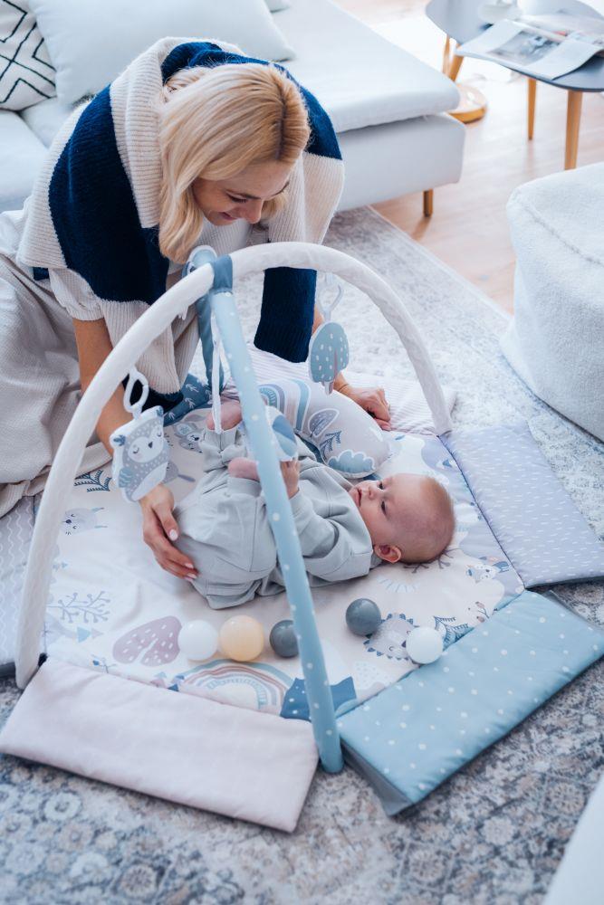 Součástí podložky je i polštářek ve tvaru croissantu, který vašemu děťátku pomůže s prvními pokusy o plazení. O pohodlí při hraní se postará příjemná tkanina, ze které je hrací deka vyrobená. Ta je opatřena termoizolační vrstvou a zajistí, aby vašemu drobečkovi nebylo chladno od podlahy.