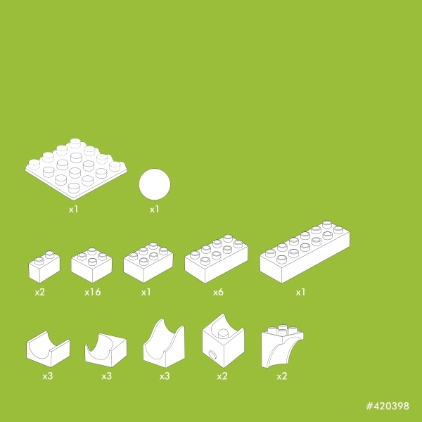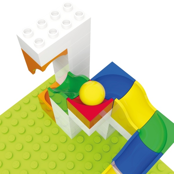 Obsah balení: 41 ks (9x prvek dráhy, 26x stavební kostka, 1x základová deska 16 x 22,5 cm, 1x kulička, 2x katapult, 2x deflektor), návod.