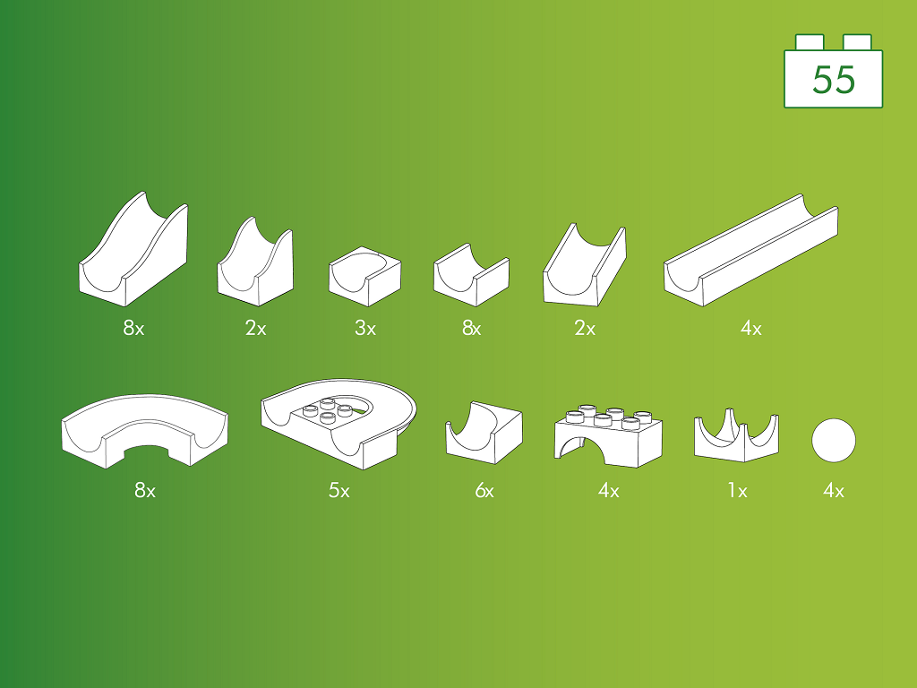 Můžete postavit jakoukoli dráhu podle dostupných návodů a nebo zapojit fantazii a vytvořit úplně nové a originální stavby. Součástí balení je celkem 55 dílků, včetně čtyř kuliček, se kterými si děti užijí hodiny tvořivé zábavy.