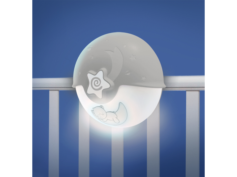 Lampička s projekcí může být připevněna na dětskou postýlku nebo postavena na noční stolek.