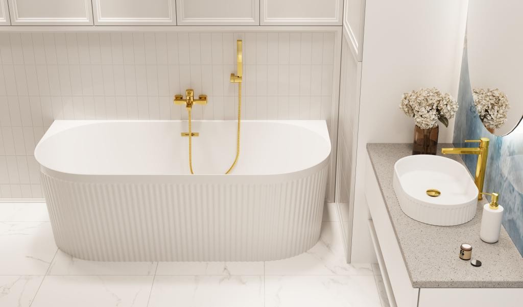 Vanová baterie GLAMOUR ve zlaté barvě je prvkem stejnojmenné řady koupelnových armatur. Klasická a funkční vanová baterie jednoduchých tvarů Vám umožní zařídit koupelnu v nadčasovém stylu. Baterie se bude zejména hodit do bílých koupelen. Dostupné také v černé a chromové barvě.