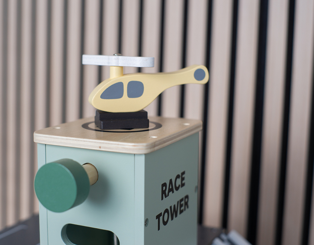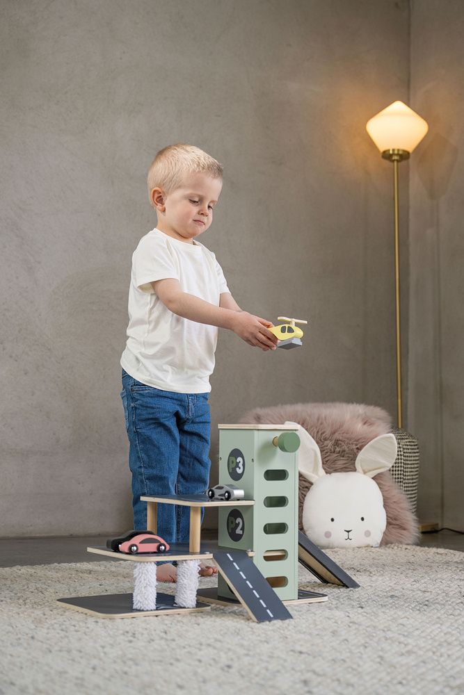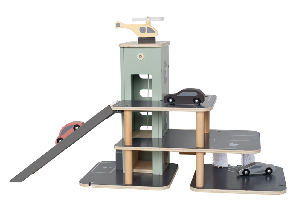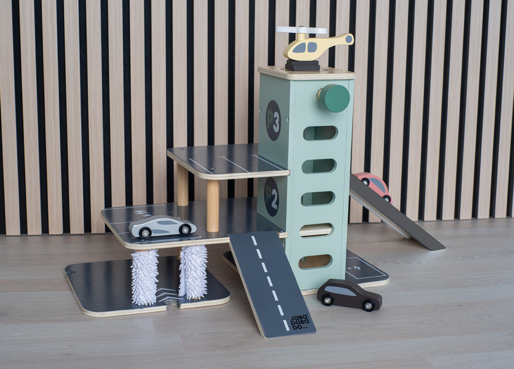 Parkování a jízda autíčky po garáži je velkou zábavou, kterou je možné posunout o úroveň výše. Součástí garáže je závodní rampa, která umožní dětem uspořádat závody. Závody s autíčky na závodní rampě mohou začít, pohodlně se na ni totiž vejdou 2 auta vedle sebe. Pokračovat mohou děti do spodního patra, kde autíčku doplní pohonné hmoty nebo dobijí baterii a umyjí je v myčce. Do vyšších pater mohou autíčka přejet po rampách nebo se nechat vyvézt výtahem. Ovládání výtahu je jednoduché, stačí točit ovládacím kolečkem. Na střeše 3patrové garáže netrpělivě vyčkává helikoptéra, která se chce rozlétnout po dětském pokoji. V garáži najdou děti spoustu parkovacích míst, na kterých mohou autíčka parkovat a odpočívat, když si s nimi právě děti nehrají. S dřevěnou garáží si děti vyhrají celé hodiny, užijí si spoustu zábavy a zdokonalí své dovednosti. Garáž je kompatibilní se všemi hračkami JaBaDaBaDo, které obsahují kolejnice. Patrová garáž podporuje kreativní hru a je dokonalým dárkem k narozeninám.
