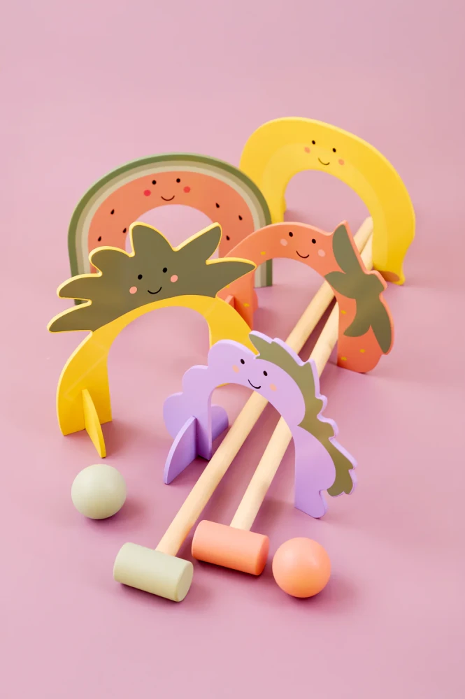 Zábava na zahradě i domaUžijte si aktivní chvíleObjevte kouzlo hry kroket, ideální pro rodinné či přátelské setkání. Je navržena pro děti od tří let, ale díky své univerzálnosti a atraktivnímu designu si ji oblíbí i starší děti a dospělí. To zajišťuje, že se celá rodina může zapojit do hry a užít si společný čas.Sada obsahuje barevné branky ve tvaru ovoce, které přidávají hře vizuální atraktivitu a zábavný prvek. Podpora rozvoje dětíRozvíjí klíčové dovednostiHra je navržena tak, aby rozvíjela hrubou motoriku, logické myšlení, fantazii a kreativitu. Děti se učí plánovat své tahy a procvičují koordinaci pohybů při manipulaci s paličkami.Podporuje sociální interakci a týmového ducha, to je klíčovým faktorem pro zdravý vývoj dětí. Hra je tedy nejen zábavou, ale i nástrojem pro rozvoj důležitých životních dovedností.Technické parametryObsah balení5x branka, 2x palička, 2x míček