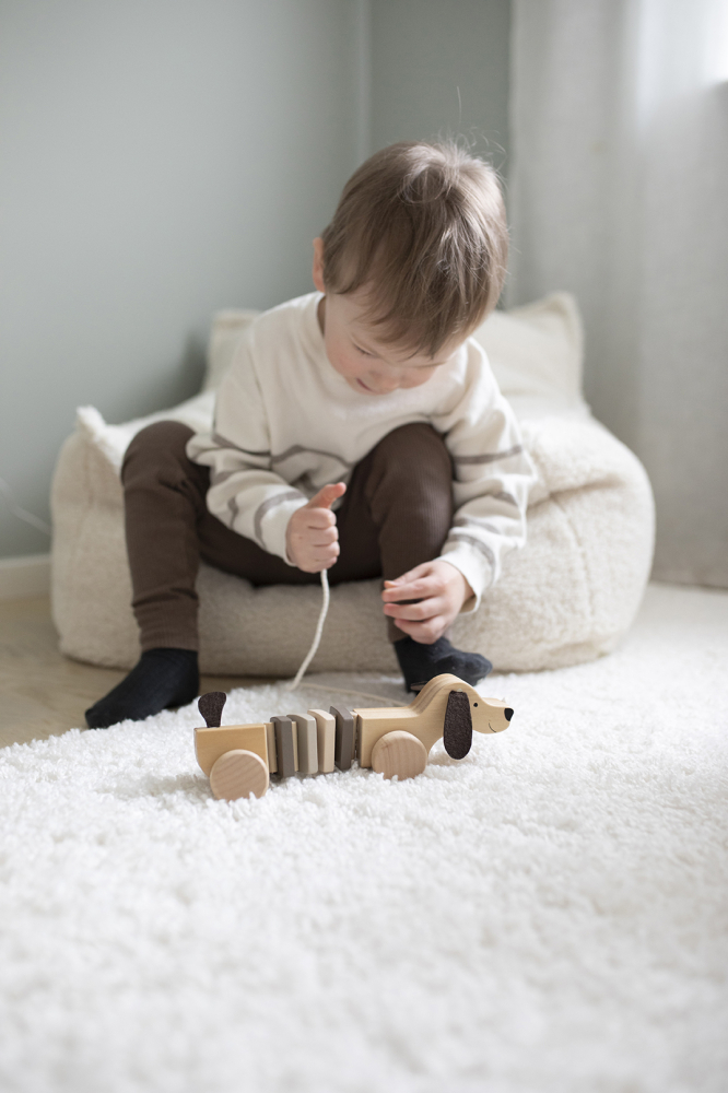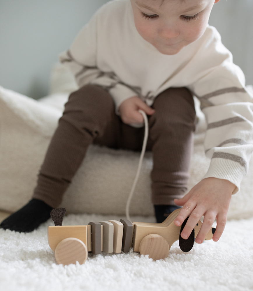 Že není možné, aby měly nejmenší děti vlastního pejska? Ale jistě že je! Dřevěný roztomilý jezevčík poslechne svého páníčka na slovo a půjde za ním úplně kamkoliv. Nejmenší děti budou zkoumat měkké a ohebné tělíčko, ouška i kolečka a tím si procvičí jemné motorické dovednosti.