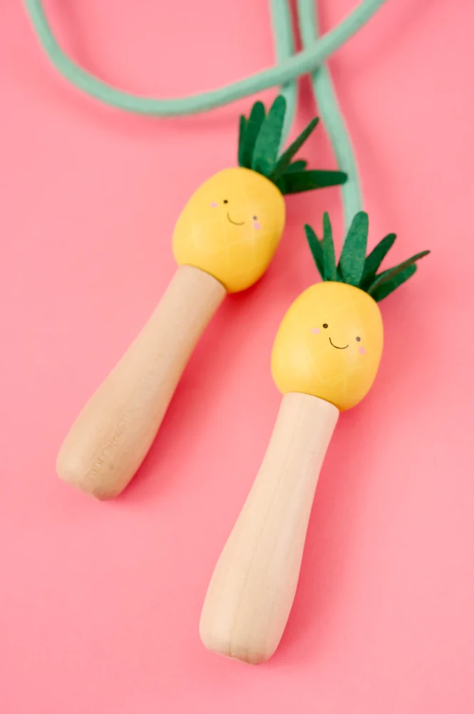 Stylové dřevěné rukojeti a přírodní vzhled. Přirozený design pro děti. Švihadlo pro děti je vybaveno stylovými dřevěnými rukojeťmi, které jsou jemně malovány do podoby ananasu. Kombinace žluté a zelené je atraktivní pro malé děti, které milují pestré barvy…